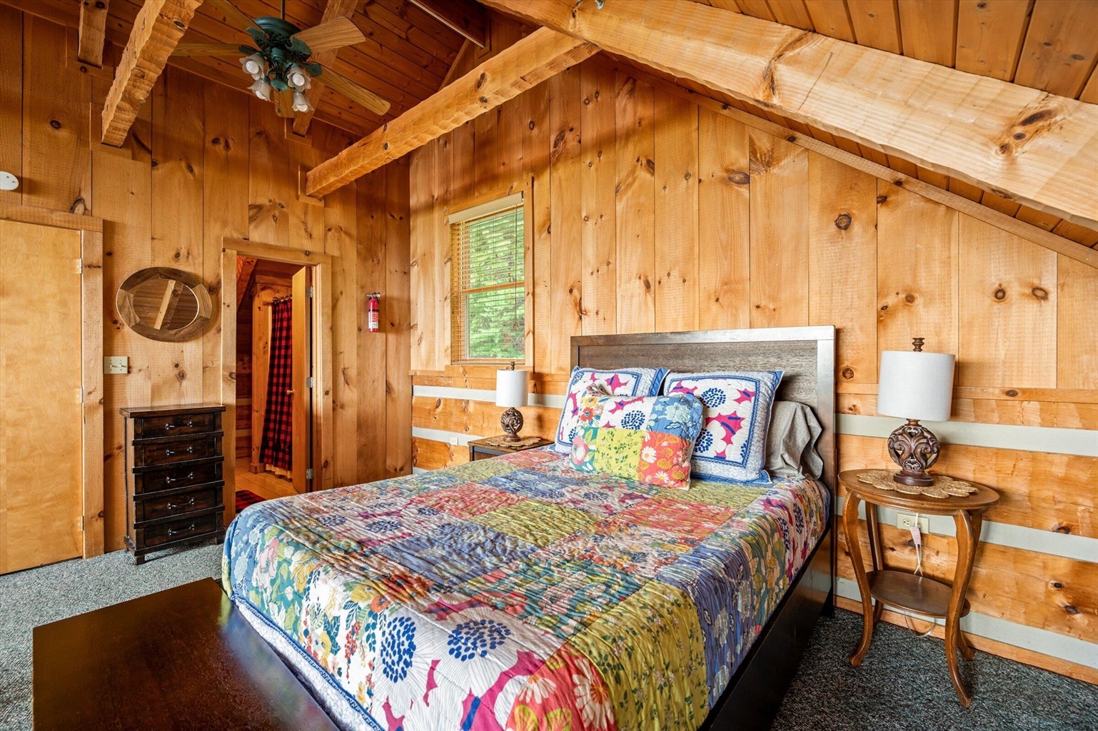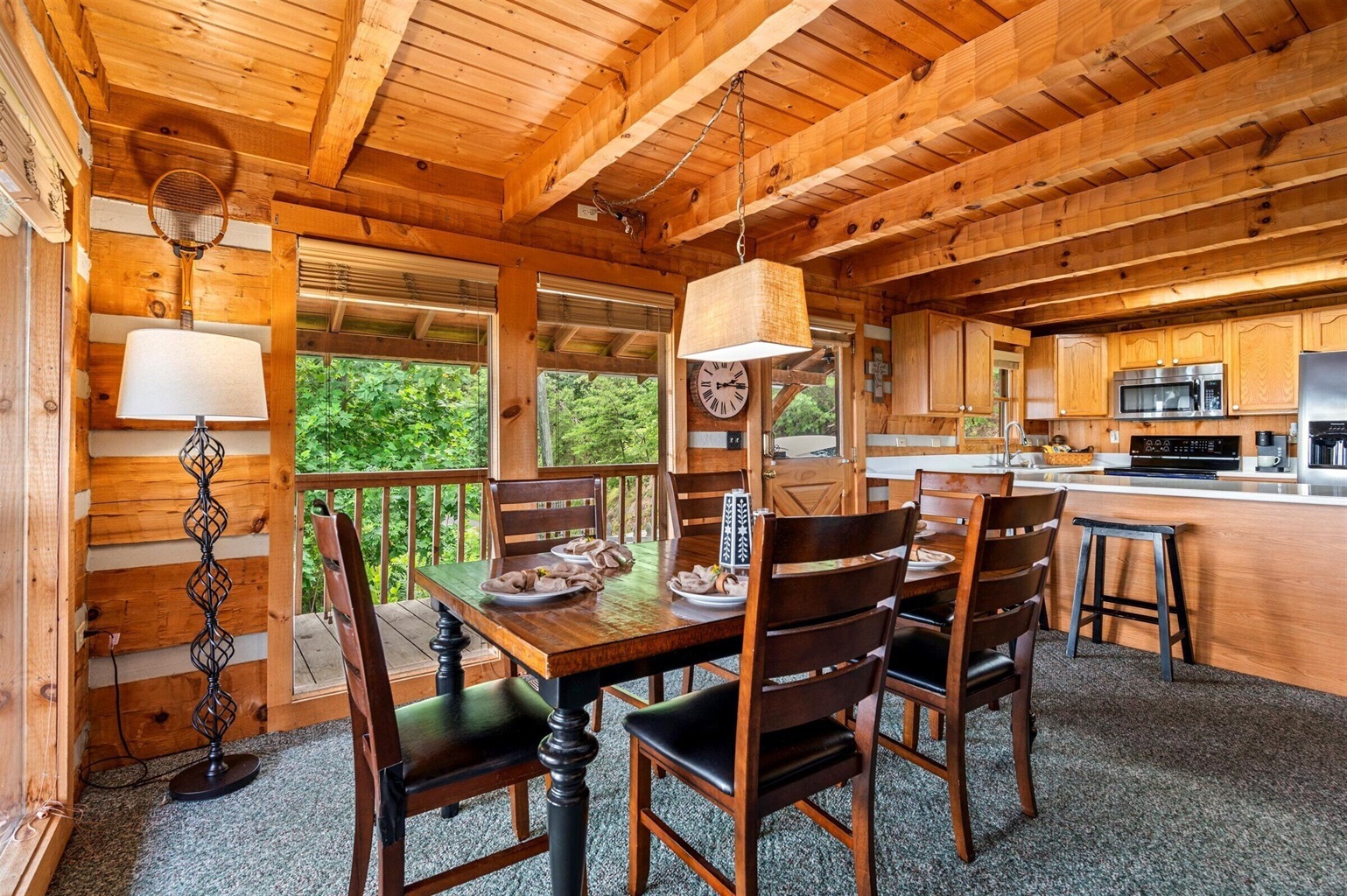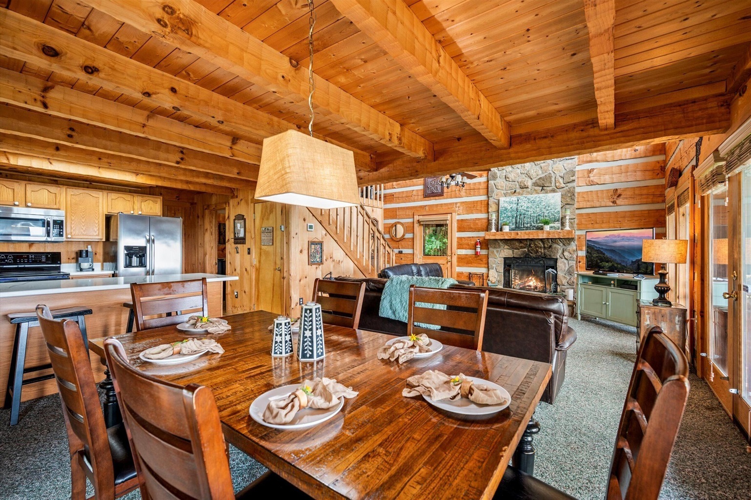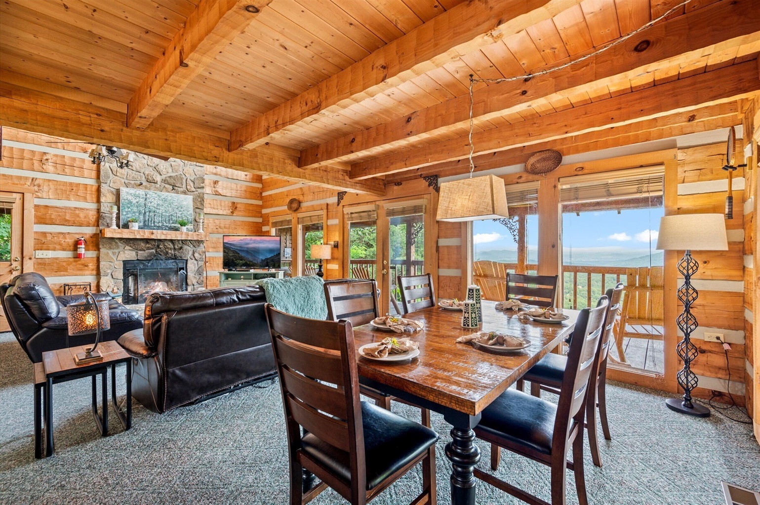 Inside, the cabin is beautifully furnished, updated, and comfortable, making you feel right at home. Snuggle by the wood-burning fireplace or unwind in the hot tub as you take in the scenery.