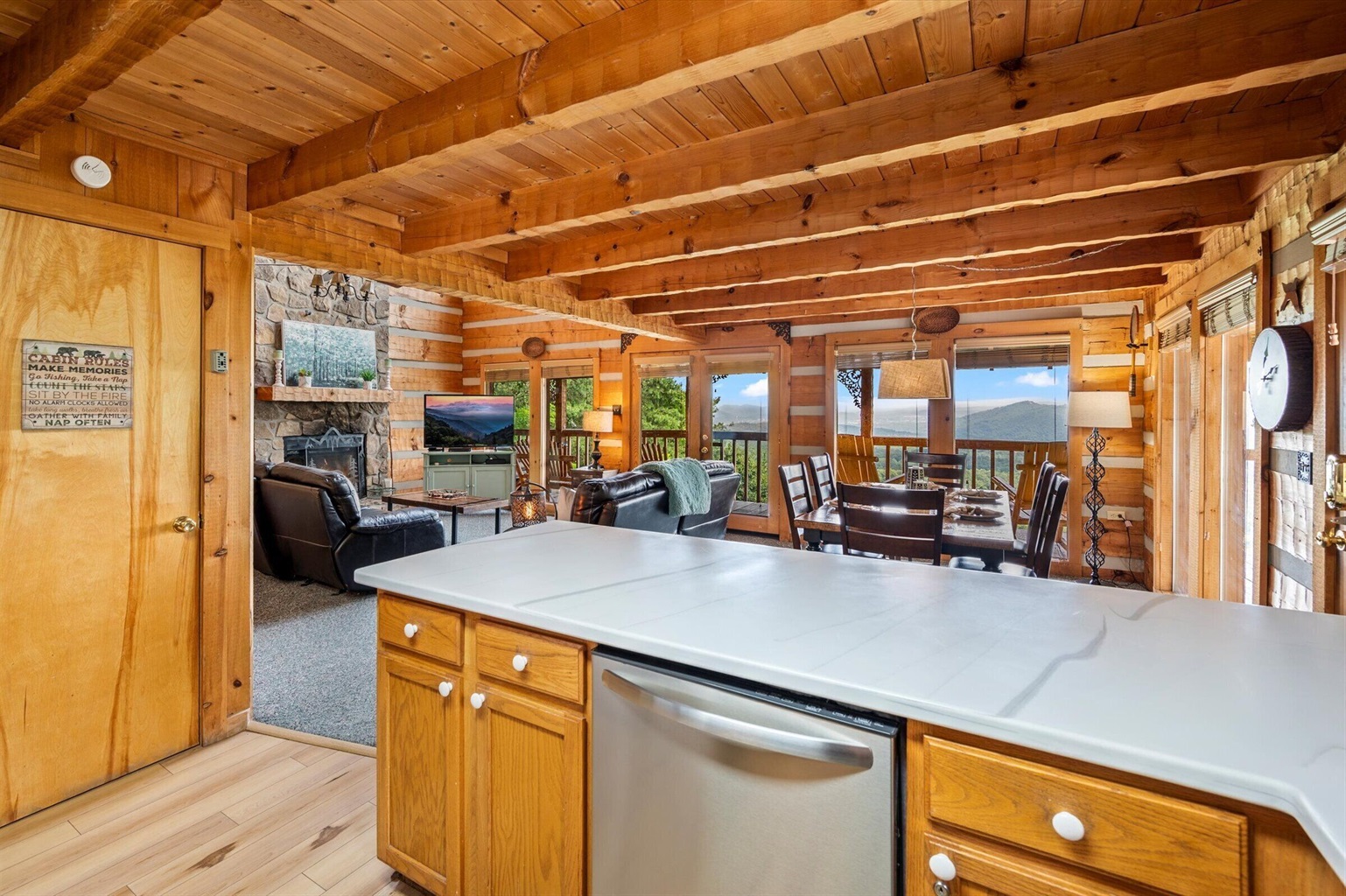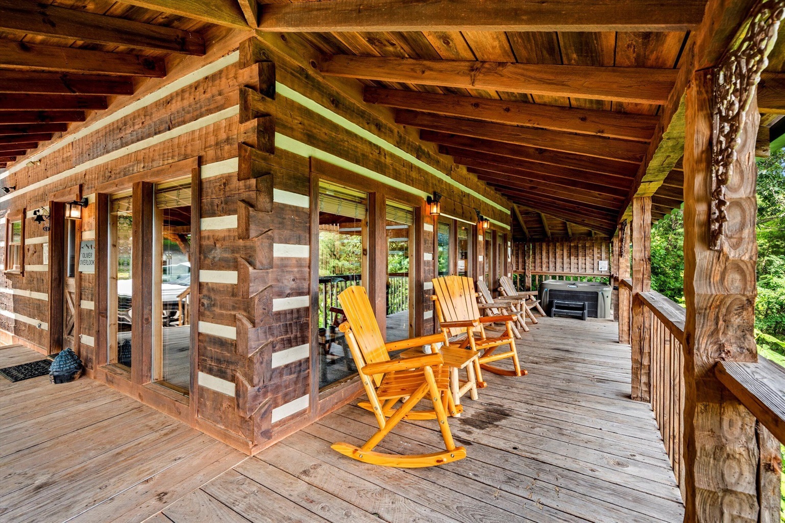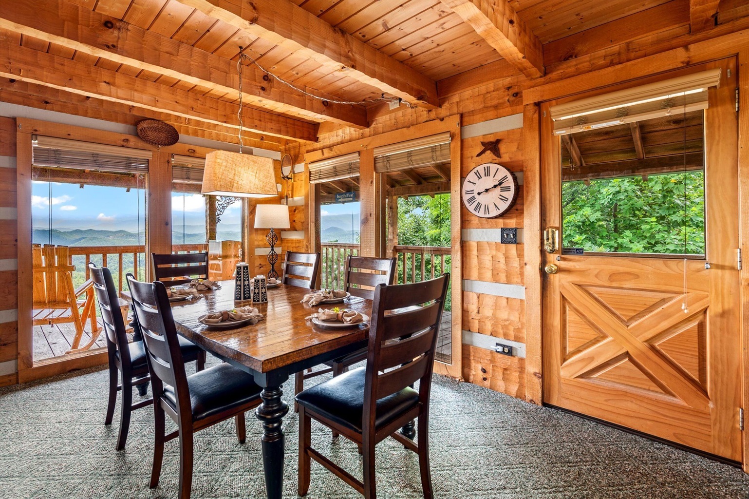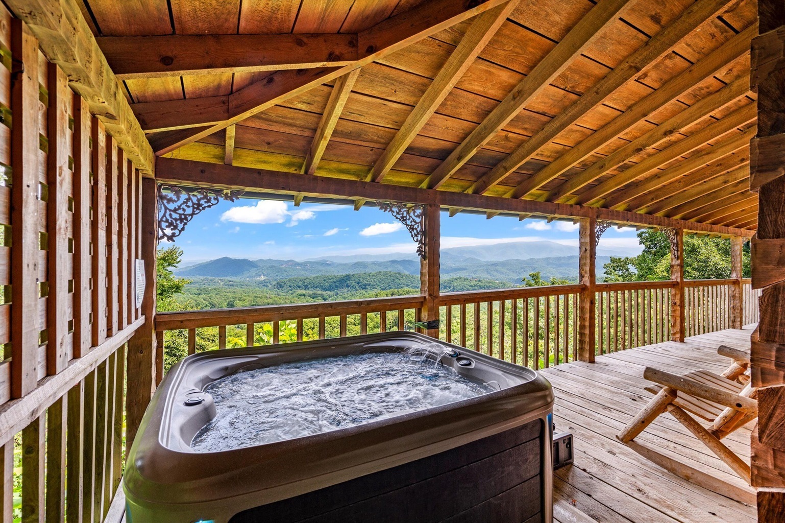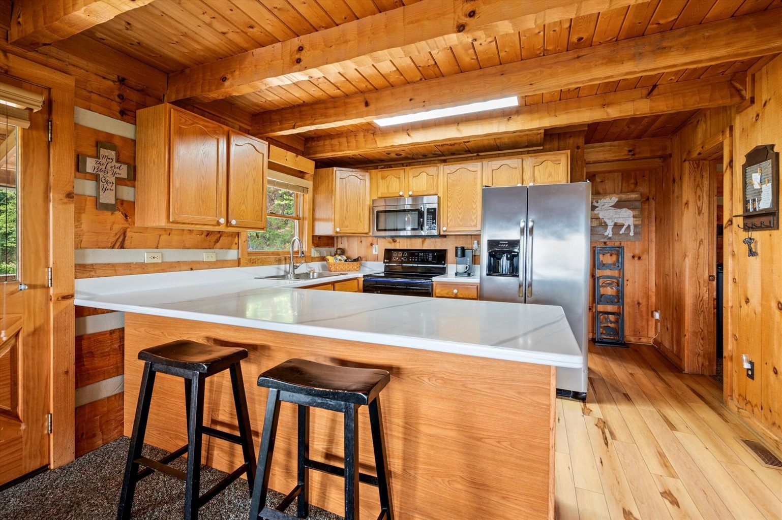 Inside, the cabin is beautifully furnished, updated, and comfortable, making you feel right at home. Snuggle by the wood-burning fireplace or unwind in the hot tub as you take in the scenery.