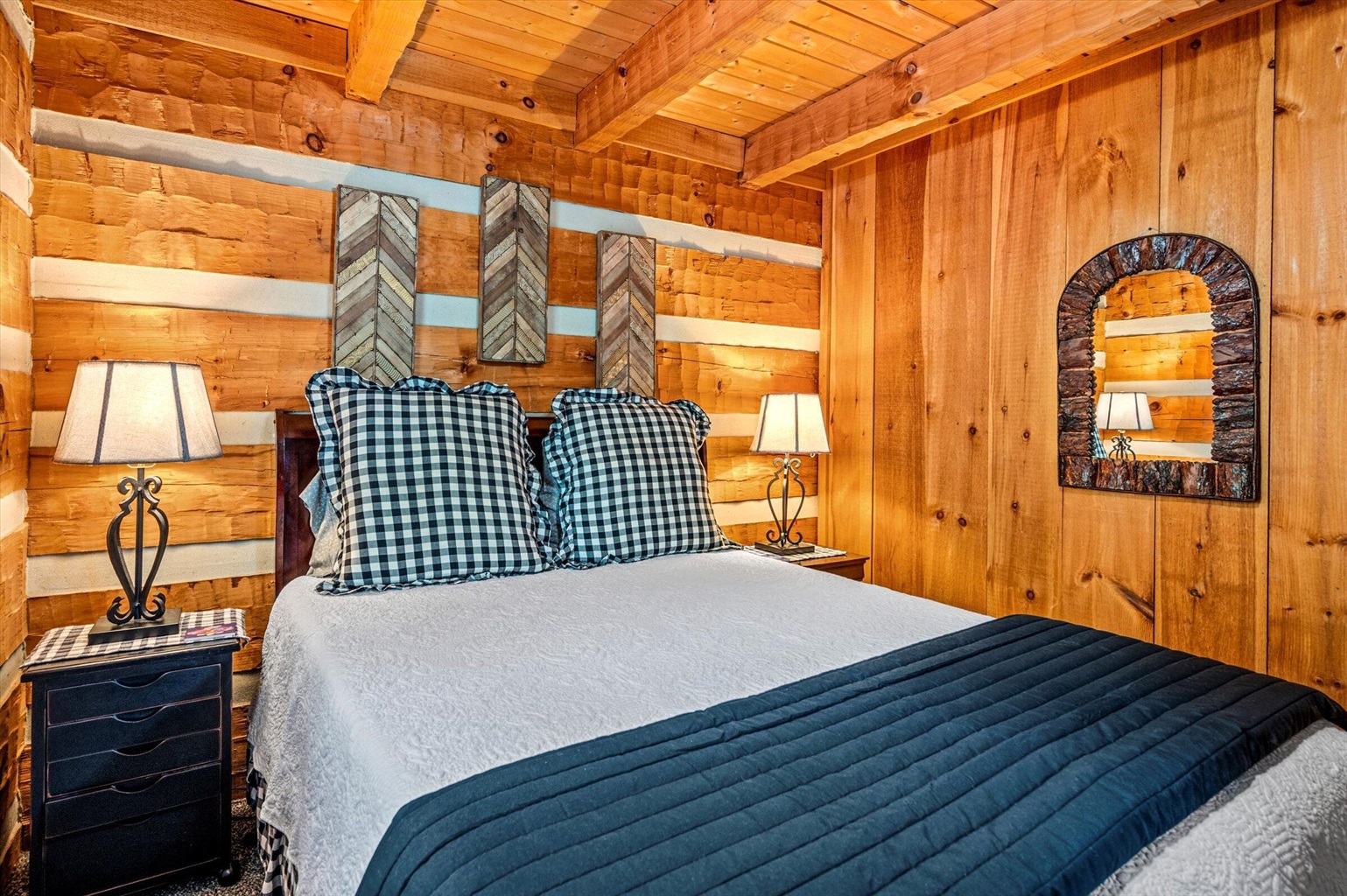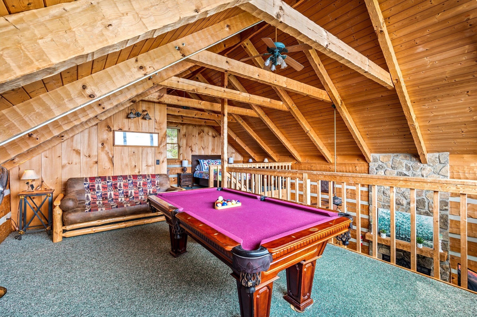 Oliver Overlook comfortably sleeps up to 6 guests. The main level has a queen bedroom with a full bathroom just across the hall. Upstairs, the loft is divided into two spaces: one side is a Game Room with a Pool table, while the other features a king bedroom with its own private bathroom.