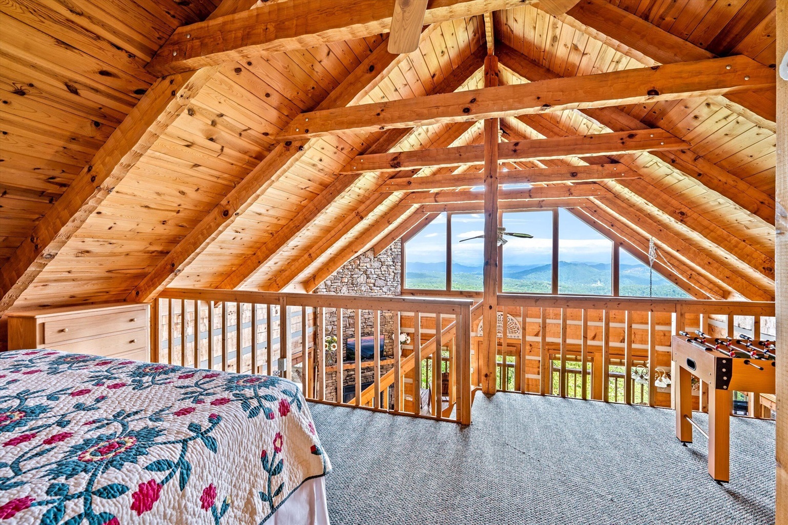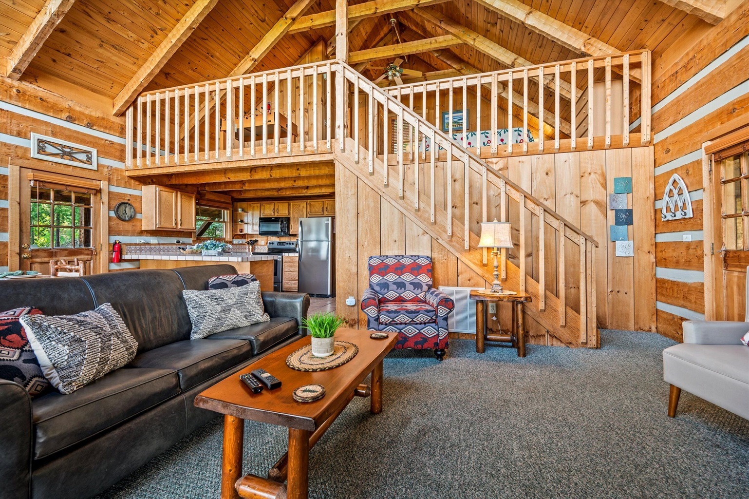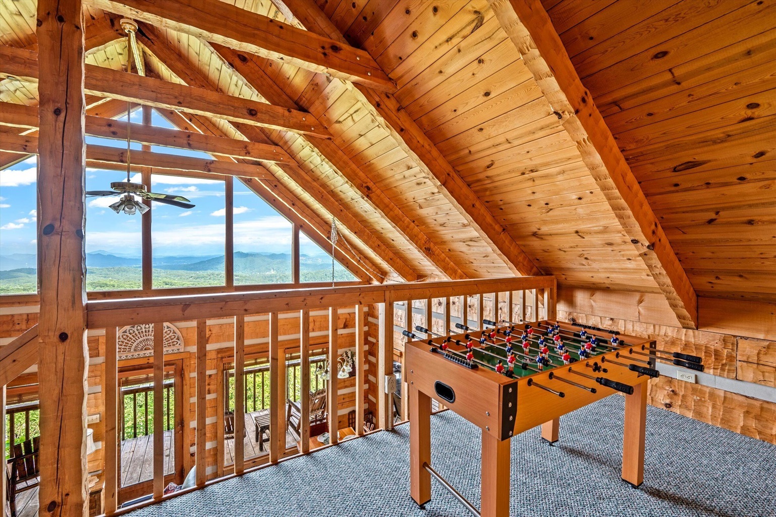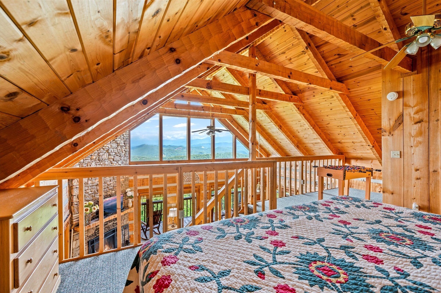 Inside, you’ll find a warm and inviting living space with floor-to-ceiling windows, an open floor plan, and a wood-burning fireplace—perfect for cozy nights in. The main level features a queen bedroom with a full bathroom across the hall, while the upstairs loft offers two spaces: one side with a Foosball table for fun and games, and the other with a queen bedroom and private bathroom for added comfort. Relax by the fire pit while taking in breathtaking mountain views. Sit back in the swing or rock gently in a chair as you soak in the stunning mountain views.