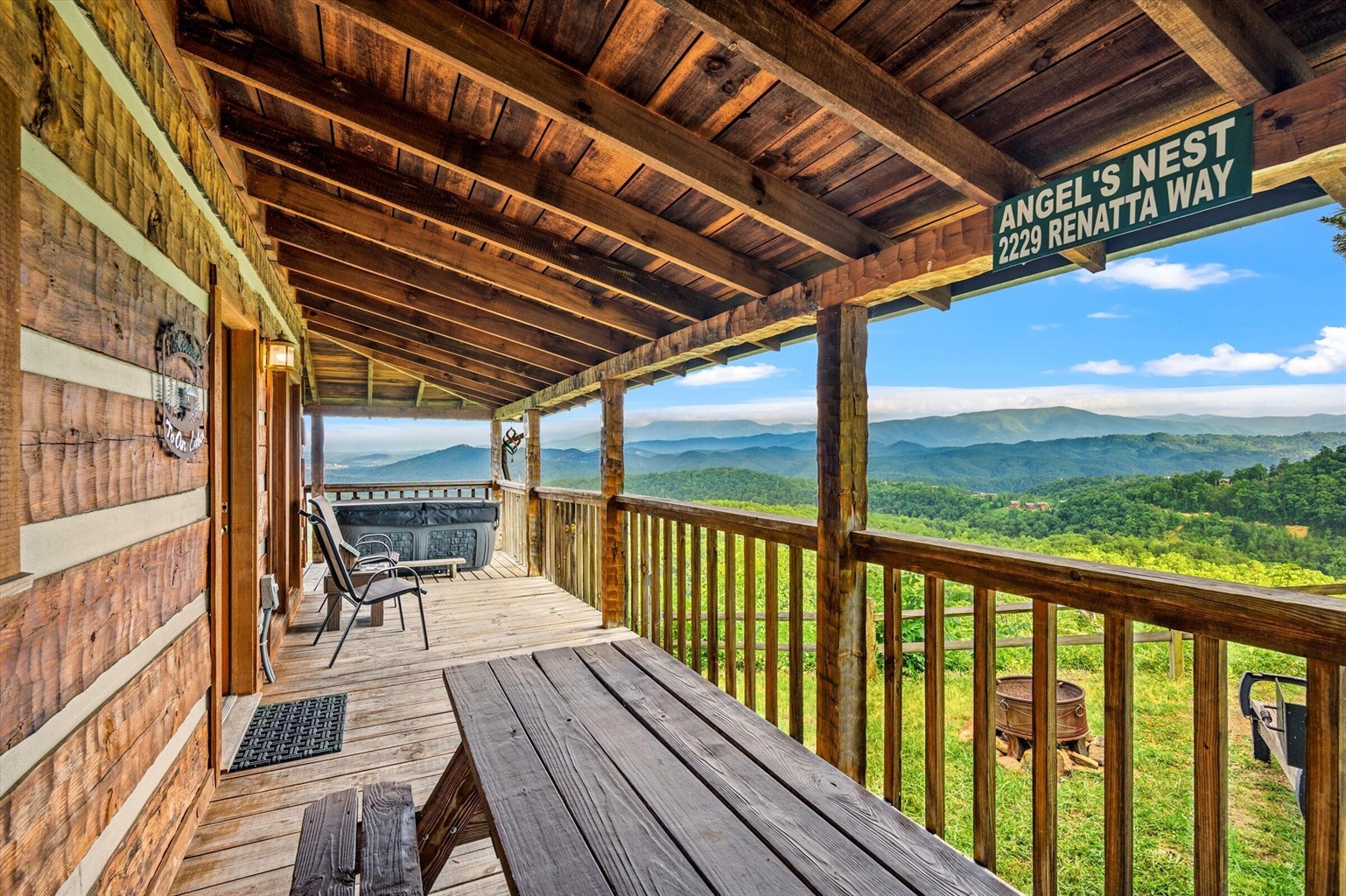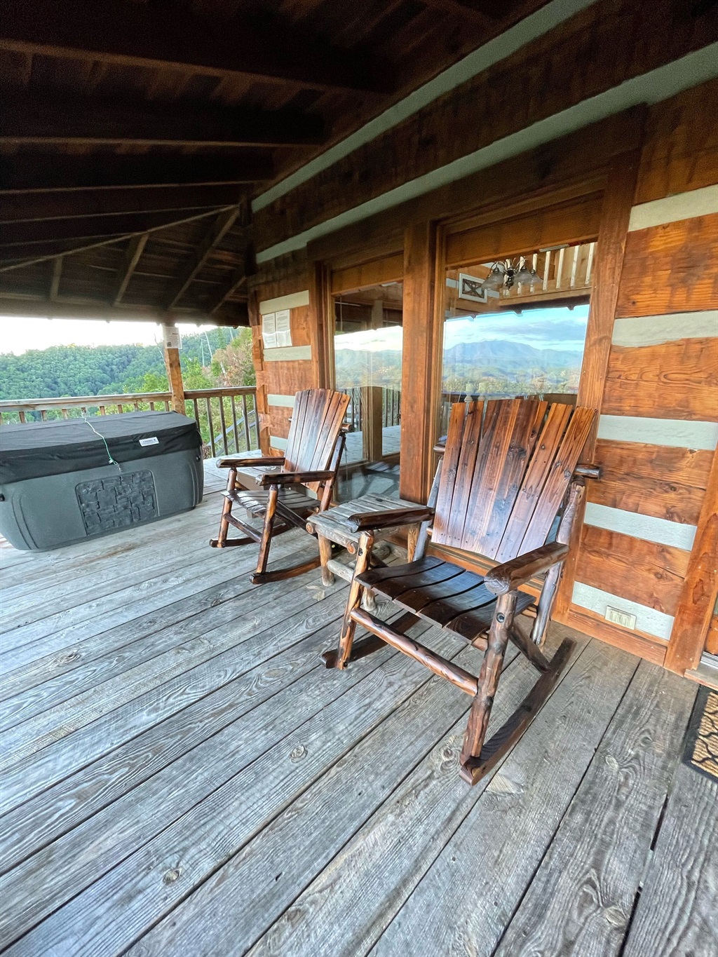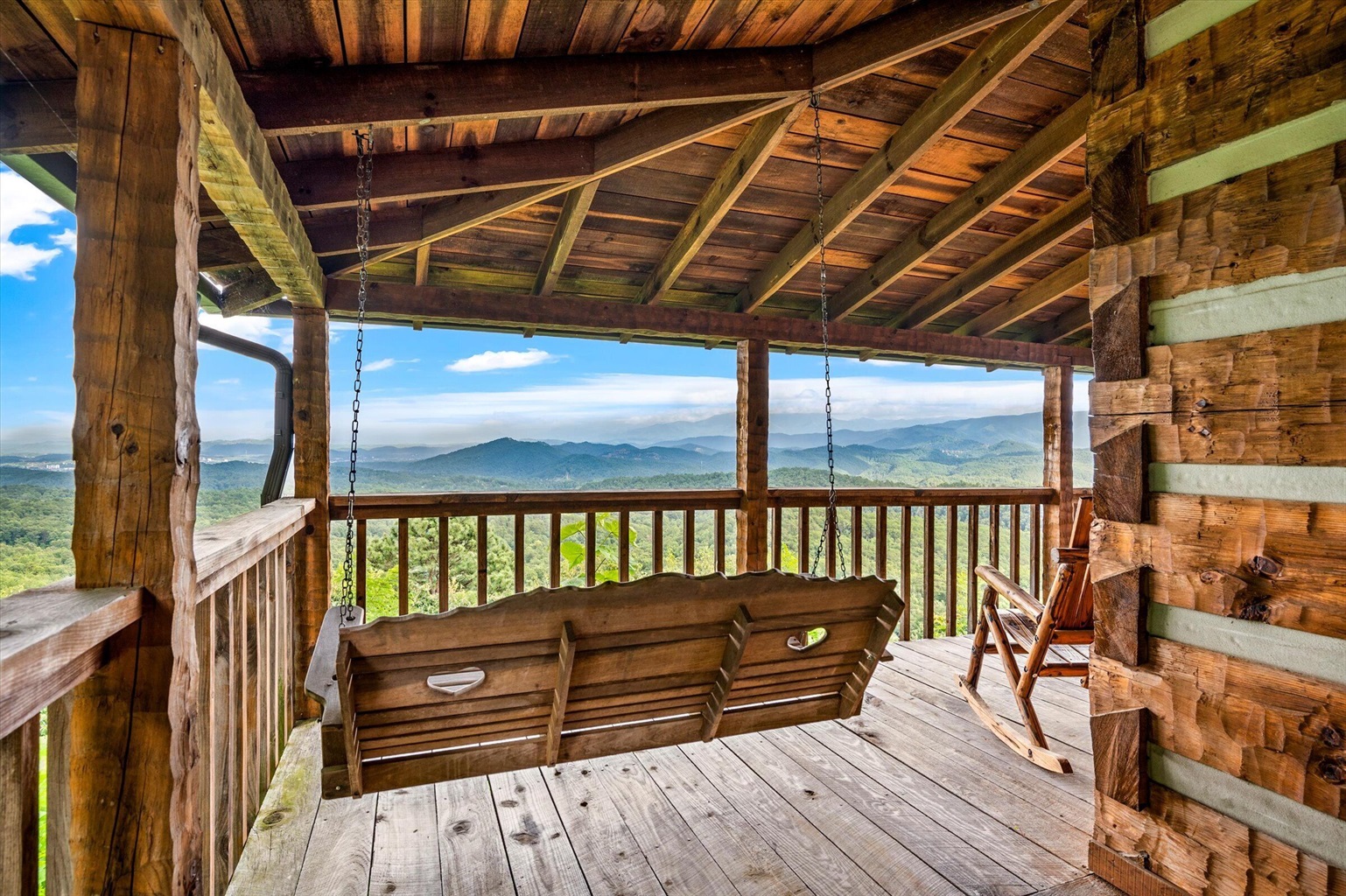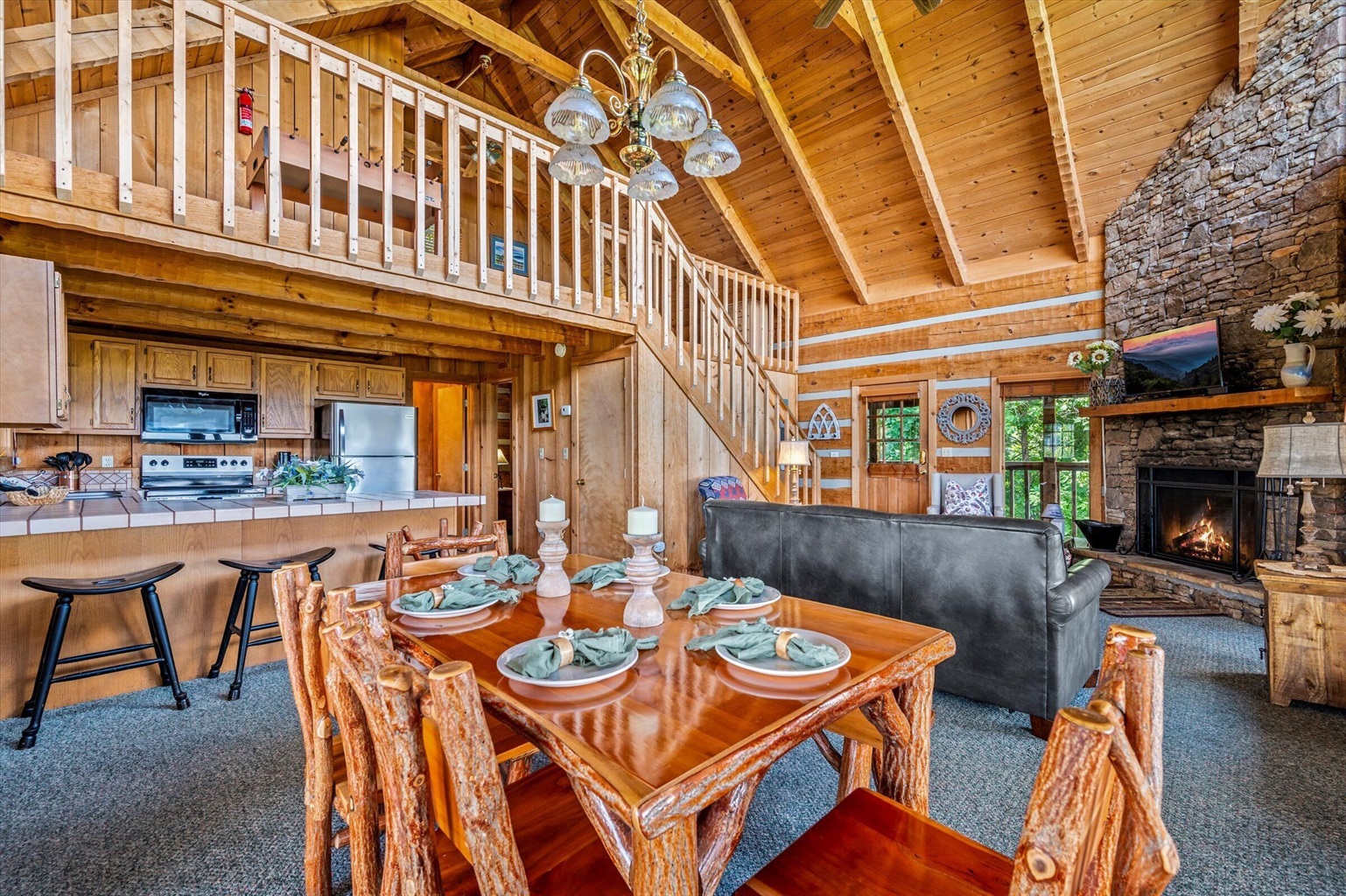 Inside, you’ll find a warm and inviting living space with floor-to-ceiling windows, an open floor plan, and a wood-burning fireplace—perfect for cozy nights in. The main level features a queen bedroom with a full bathroom across the hall, while the upstairs loft offers two spaces: one side with a Foosball table for fun and games, and the other with a queen bedroom and private bathroom for added comfort. Relax by the fire pit while taking in breathtaking mountain views. Sit back in the swing or rock gently in a chair as you soak in the stunning mountain views.